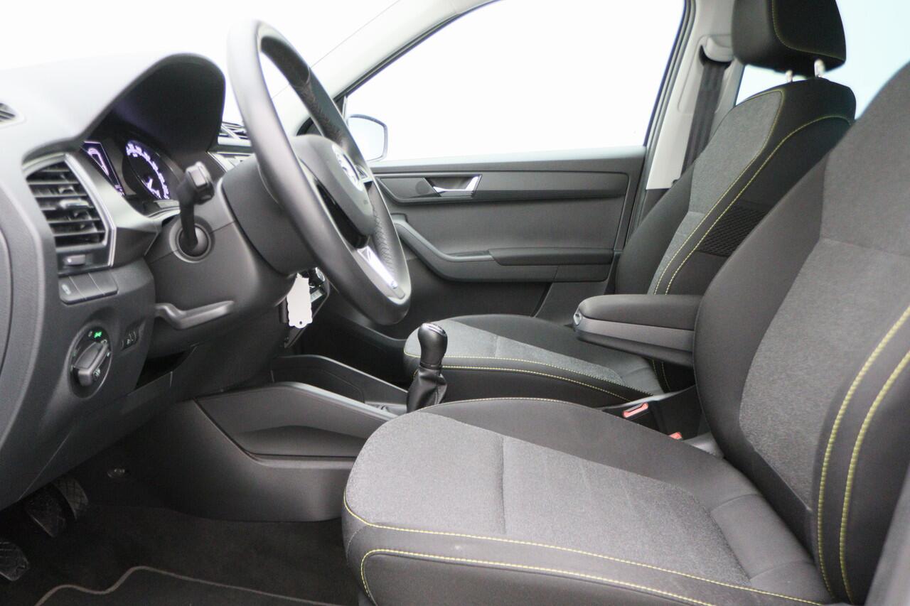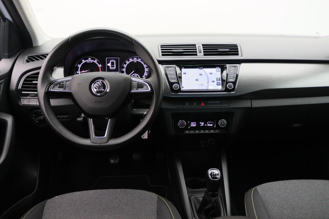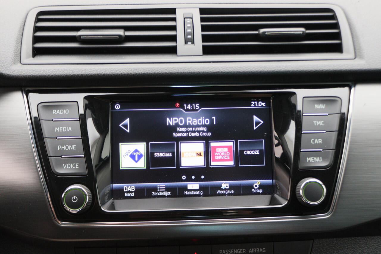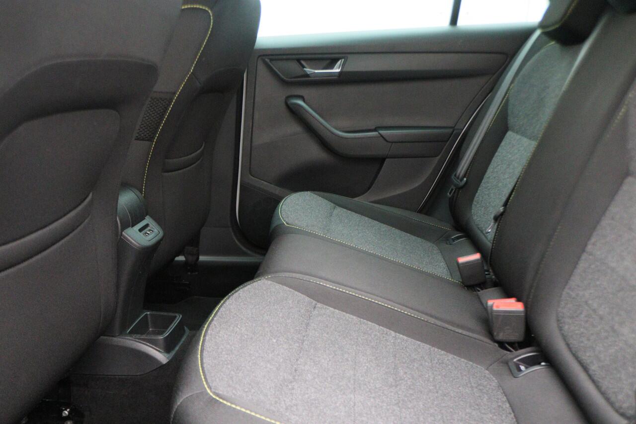 deze ŠKODA Fabia Combi. Deze auto is uitgerust met een driecilinder benzinemotor en een handgeschakelde vijfversnellingsbak. Bij de complete uitrusting van deze auto behoren ook 16 inch lichtmetalen velgen