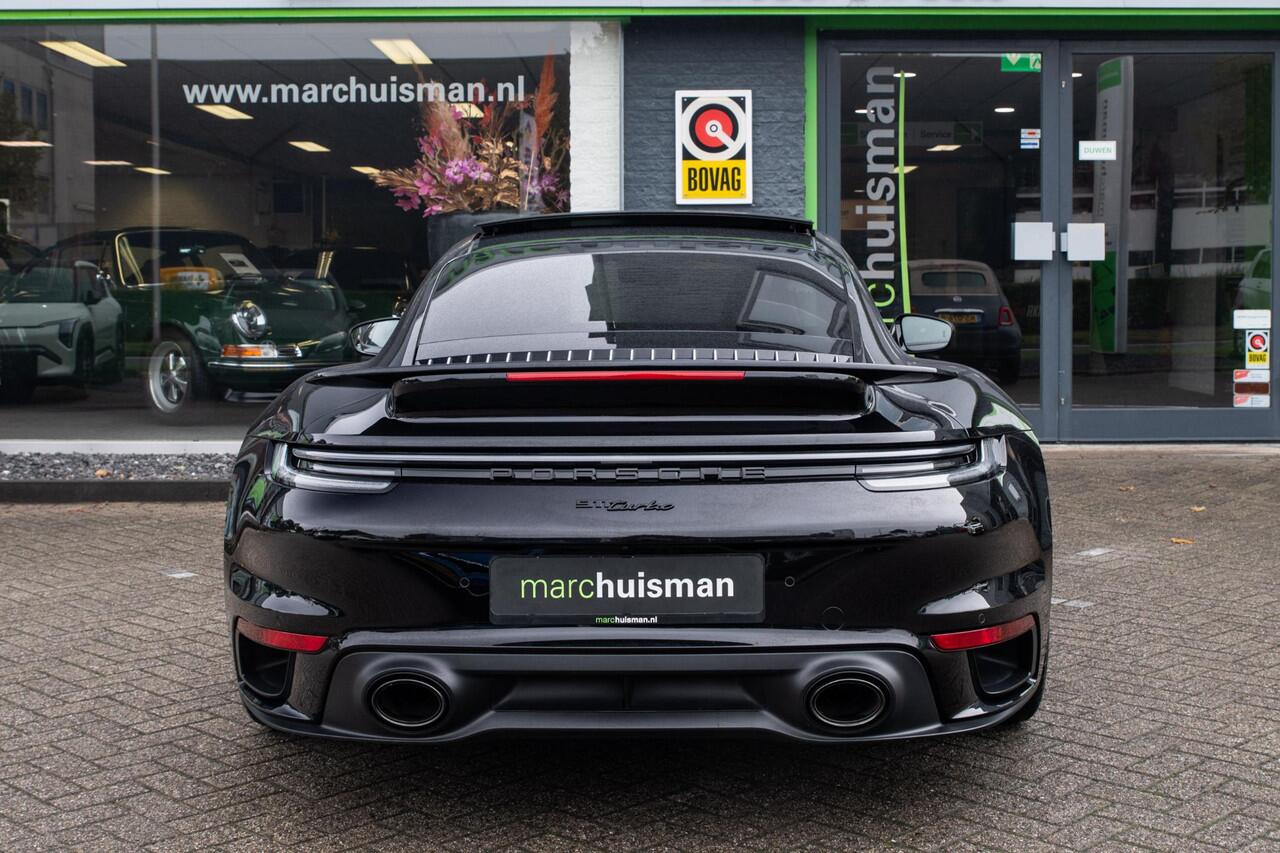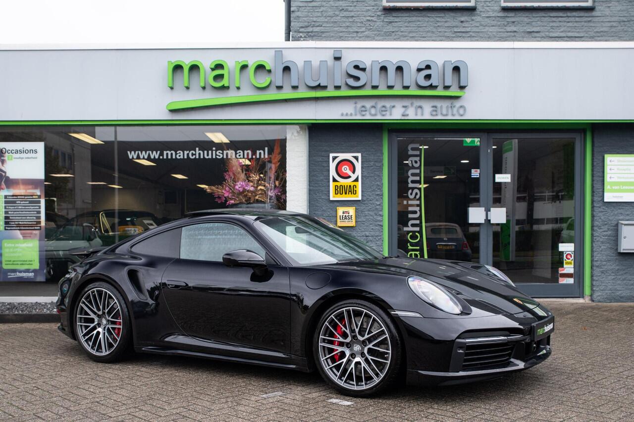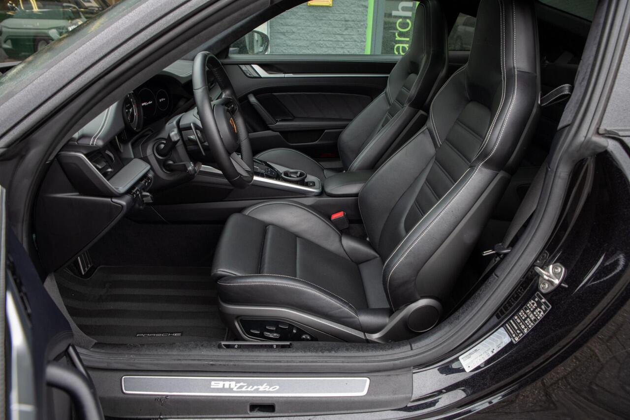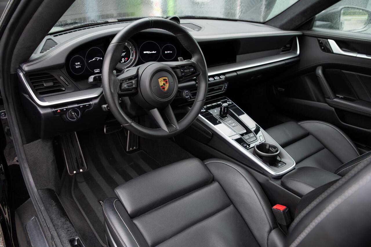 Schitterende Porsche 911 992 Coupe 3.8 Turbo. Uitgerust in Diepzwart metallic i.c.m. zwart lederen bekleding en stiksels in "krijt" kleur. Uitgerust met o.a. hemelbekleding in Race-Tex (alcantara)