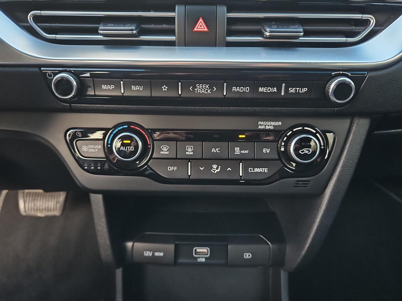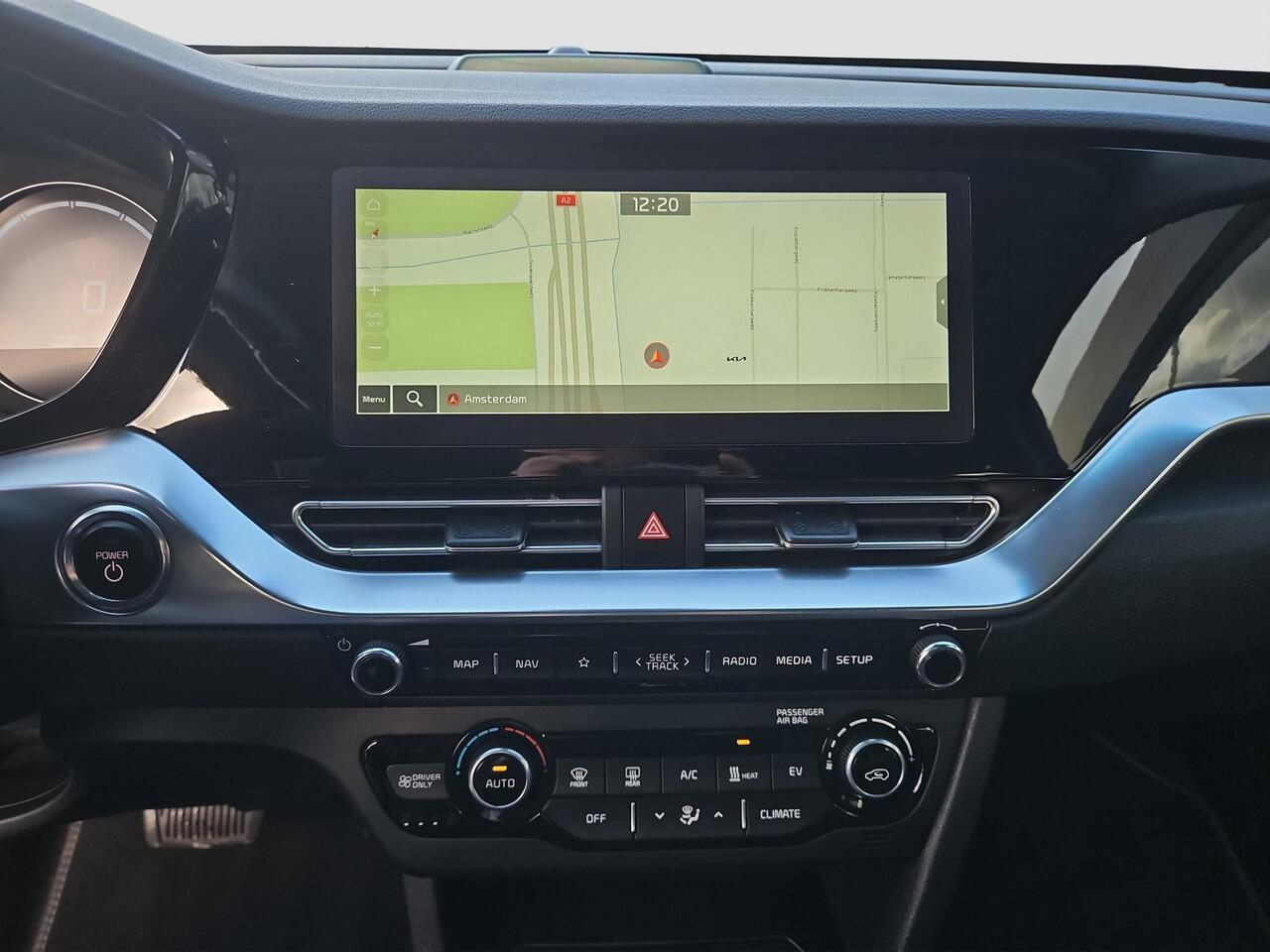 regelt de auto zelf de snelheid en de afstand tot de auto voor u. U kunt het audio-installatiesysteem met DAB-ontvangst en het full map navigatiesysteem bedienen met de knoppen op het stuur of zelf met uw stem. Het comfort wordt verhoogd door de aanwezige electronic climate control. Achter het stuur van deze Kia bent u niet alleen. De auto kijkt als het ware met u mee tijdens de rit. De regensensor schakelt de ruitenwissers in als het nodig is en de automatisch inschakelbare verlichting doet de lichten voor u aan. Extra opties op deze auto zijn: keyless entry en automatisch dimmende binnenspiegel.