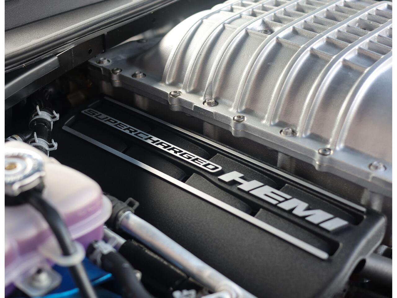 Laten we beginnen met de olifant in de kamer: Onder de brede motorkap met twee grote luchtinlaten schuilt een 6.2L V8 die voorzien is van een 2.4L supercharger. Hiermee produceert de motor een vermogen van 727 PK en 890 Nm koppel. Een 0 naar 100 sprint kost slechts 3