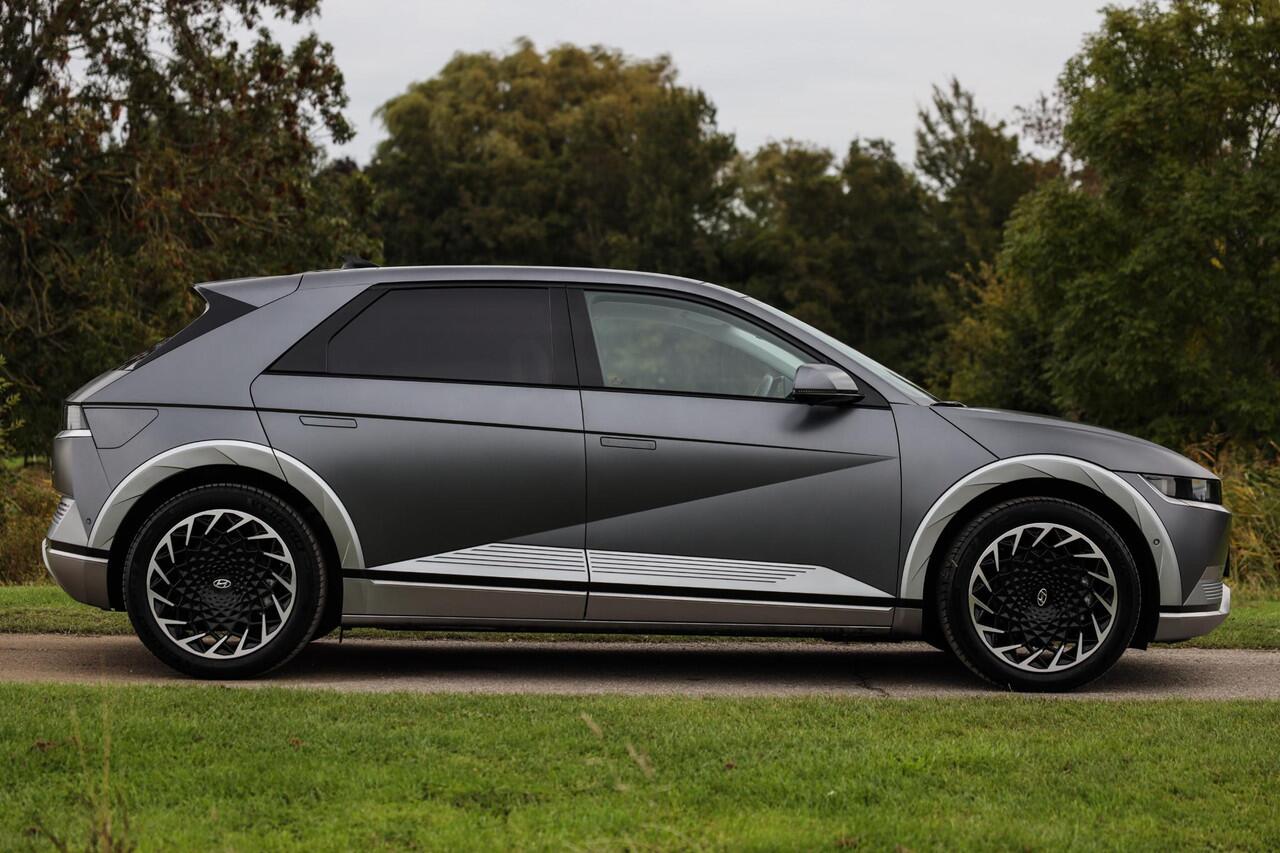 Deze Hyundai IONIQ 5 AWD uit 2022 is uitgevoerd in Shooting Star Gray Matte en combineert 306 pk met luxe opties als panoramadak