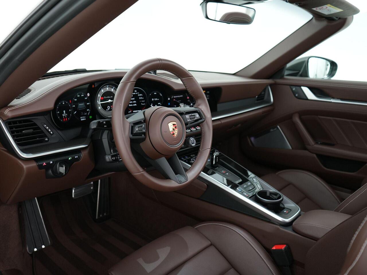 gecombineerd met een donkerbruin lederen interieur. Een schitterende en zeldzame samenstelling die deze Turbo S meteen onderscheidt van de rest. De auto is afkomstig uit 2024