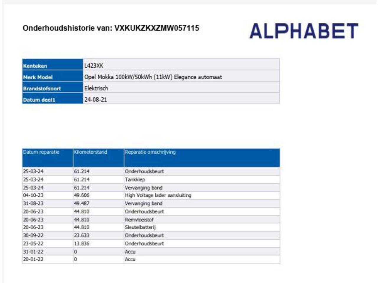 NL 0713419090 http://www.vanschie.nl info@vanschie.nl Overige informatie Onderhoudsboekjes: Digitaal Laadtijd normaal stopcontact: 13:53 Laadtijd aan krachtstroom aansluiting 3 fase: 02:16 Bruikbare accucapaciteit: 47.5 kWh Ingeschatte actieradius: 278 km Ingeschat verbruik: 19.81 kWh/100km Actieradius praktijk zomer: 240 km Actieradius praktijk winter: 207 km Verbruik praktijk zomer: 19.5 kWh/100km Verbruik praktijk winter: 23.36 kWh/100km <B>Zorgeloos rijden - zonder extra kosten</B> ? Volledige onderhoudsbeurt uitgevoerd ? Technisch gecontroleerd en afgeleverd volgens BOVAG-normen <B>All-in Servicepakket - inbegrepen in de prijs</B> ? BOVAG-garantie 12 maanden ? BOVAG pechhulp 12 maanden ? BOVAG omruilgarantie14 dagen ? BOVAG 40-puntenchecklist ? BOVAG Afleverbeurt - volgens fabrieksschema ? Grondige reiniging van interieur en exterieur ? Uit te breiden BOVAG-netwerkgarantie*** <B>Standaard rijk uitgerust - extra opties inbegrepen</B> Keyless-Entry/Start