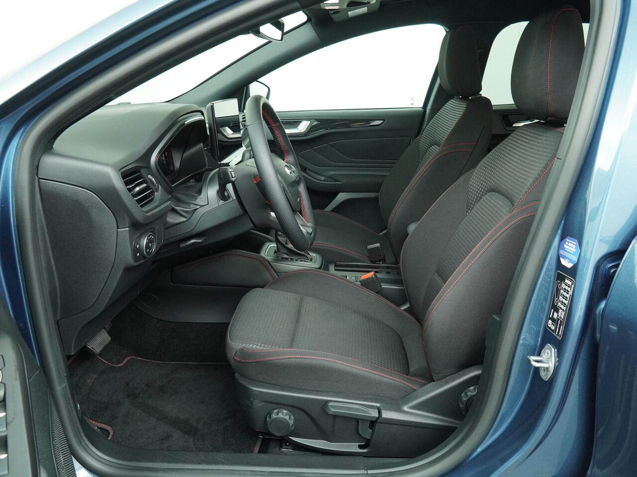 sideskirts en lichtmetalen velgen is meteen te zien dat dit geen standaard Focus is. Het onderstel is ook aangepast en 1 cm verlaagd voor een nog betere wegligging. Net zoals de meer standaardauto's biedt deze Focus een zee van ruimte. Op de achterbank is genoeg ruimte om als volwassene achter jezelf te kunnen zitten. De bekleding is uitgevoerd in zwart stof met prachtige rode stiksels. Deze auto is bovendien geleverd met verlengde fabrieksgarantie tot januari 2029