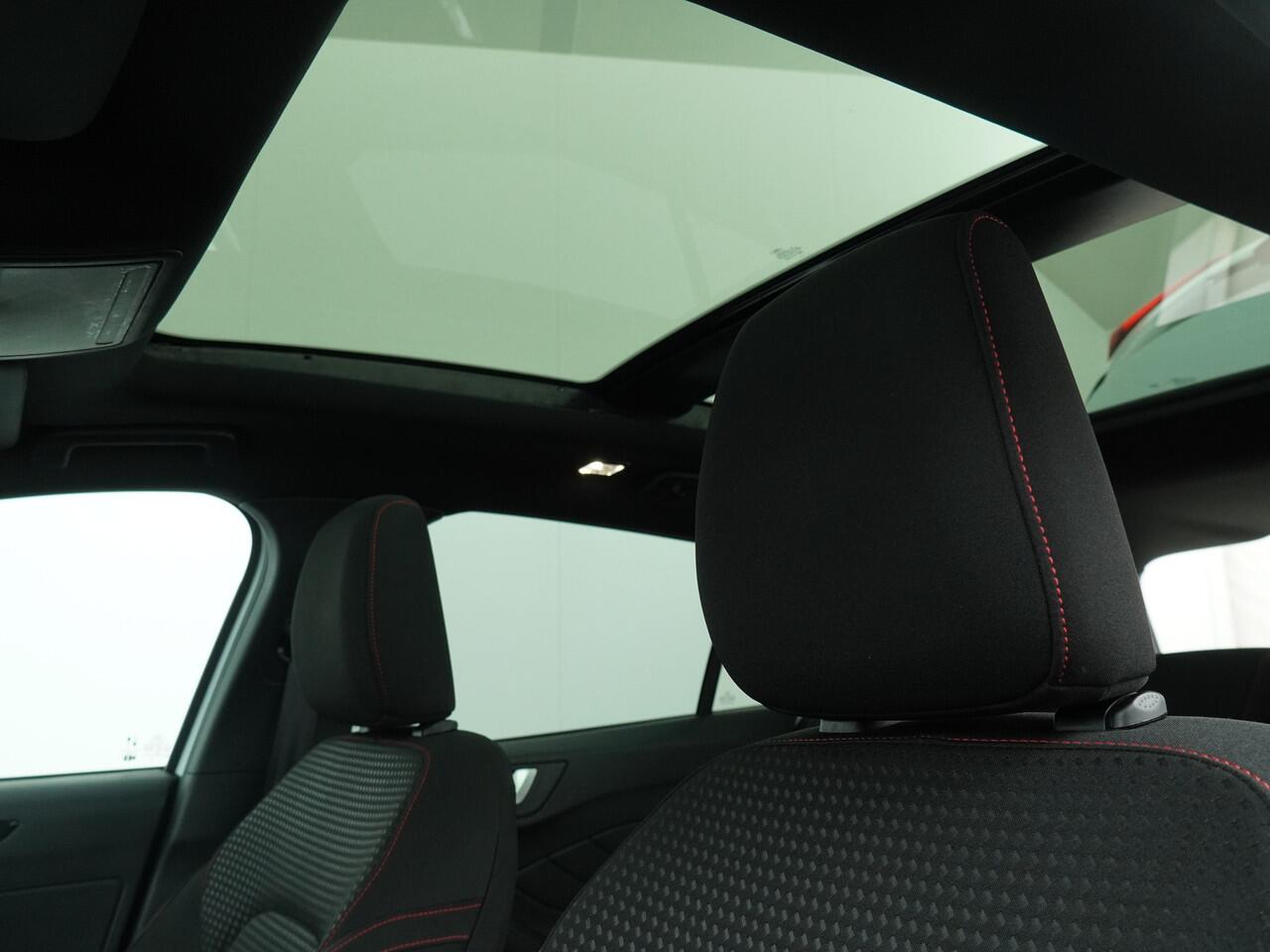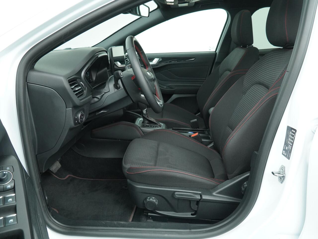 sideskirts en lichtmetalen velgen is meteen te zien dat dit geen standaard Focus is. Het onderstel is ook aangepast en 1 cm verlaagd voor een nog betere wegligging. Net zoals de meer standaardauto's biedt deze Focus een zee van ruimte. Op de achterbank is genoeg ruimte om als volwassene achter jezelf te kunnen zitten. De bekleding is uitgevoerd in zwart stof met prachtige rode stiksels. D