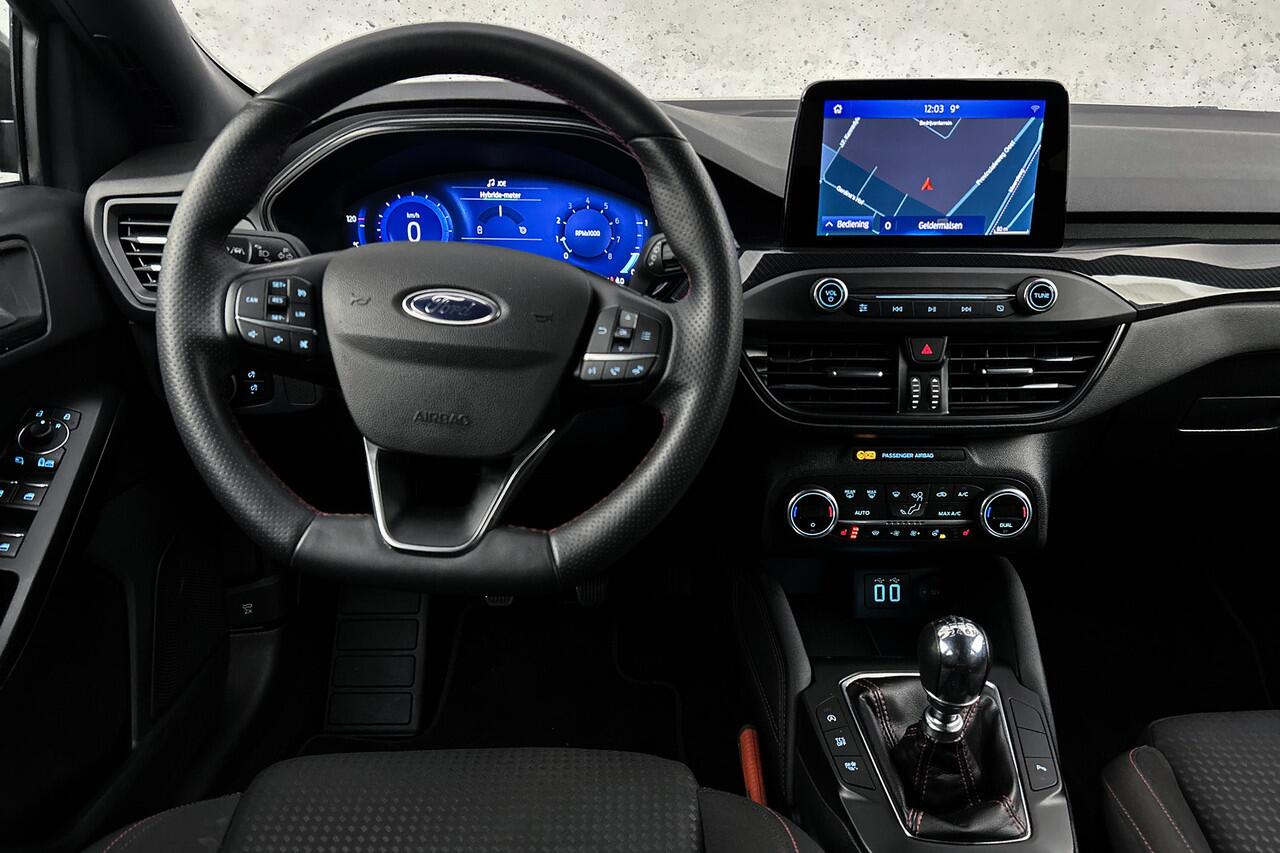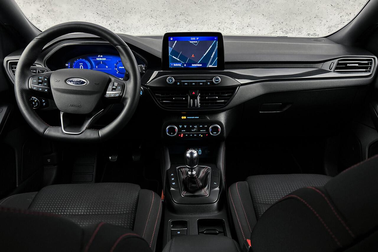 deze Ford Focus. Het is een auto uit 2021. Hij heeft een benzinemotor en een handgeschakelde zesversnellingsbak. Koude start? Niet met de verwarmbare voorstoelen! De sportstoelen zorgen ervoor dat u goed en comfortabel zit