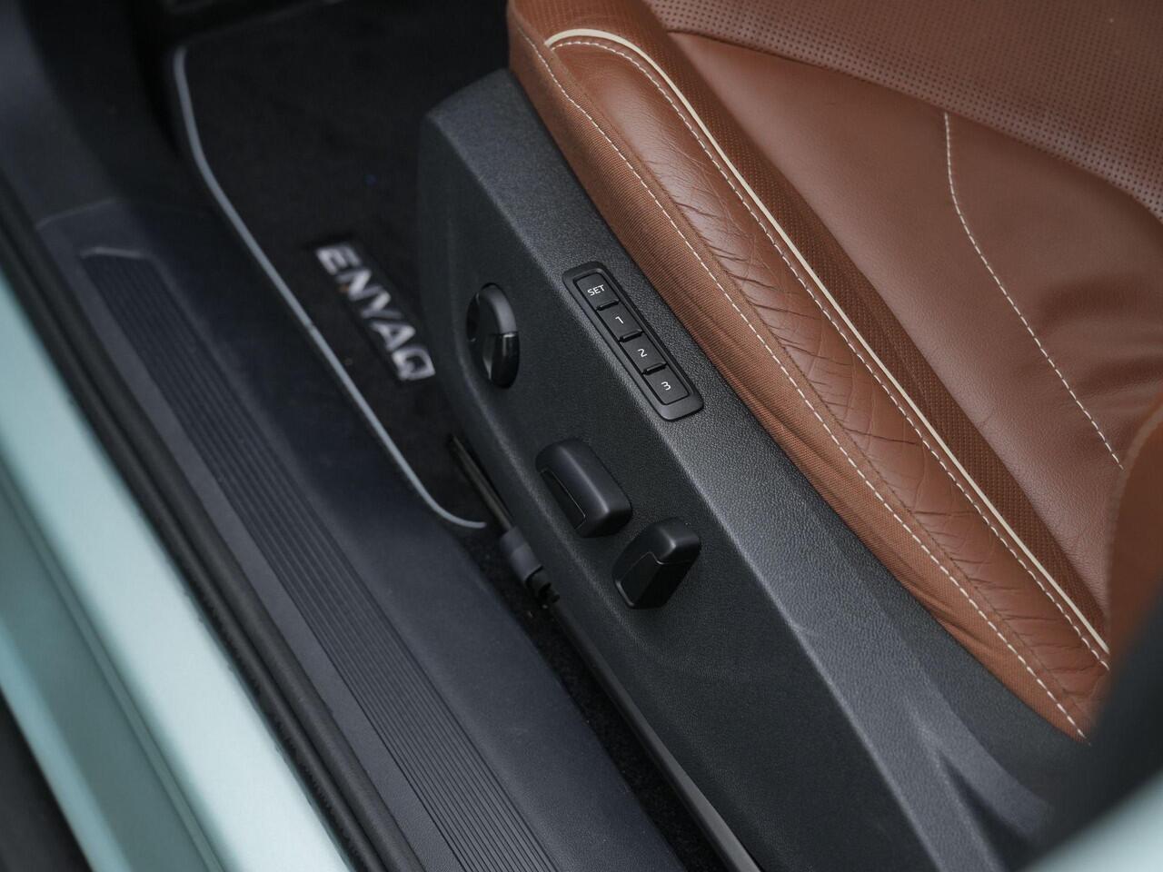 Achter het stuur ervaar je direct het verfijnde karakter van deze Enyaq. De comfortabele stoelen