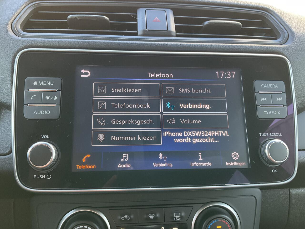 regelt de auto zelf de snelheid en de afstand tot de auto voor u. Connected Services voegt nog meer comfort en veiligheid toe aan deze auto. Deze Nissan is voorzien van knoppen op het stuur om het full map navigatiesysteem en het audio-installatiesysteem met DAB-ontvangst te bedienen. En dan is deze auto ook nog eens voorzien van automatische airconditioning