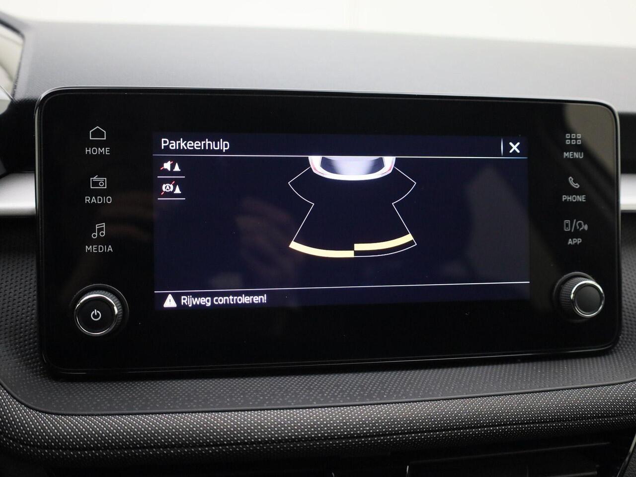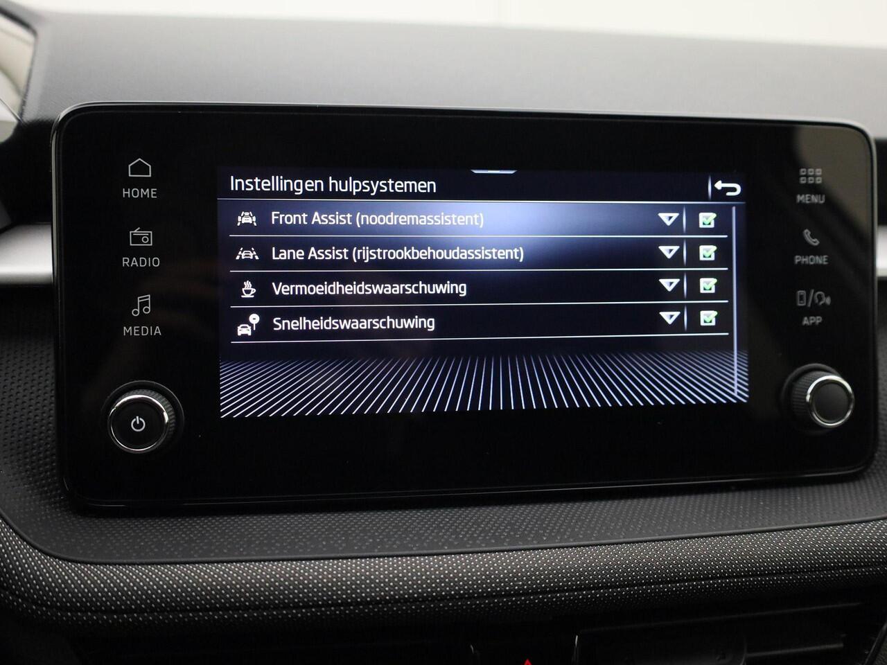 reageert het Lane-keeping systeem meteen en corrigeert. De sensor van het forward collision warning-systeem registreert permanent de afstand tot voorliggers en grijpt in als een botsing dreigt. In deze Skoda vinden we verder een front assist