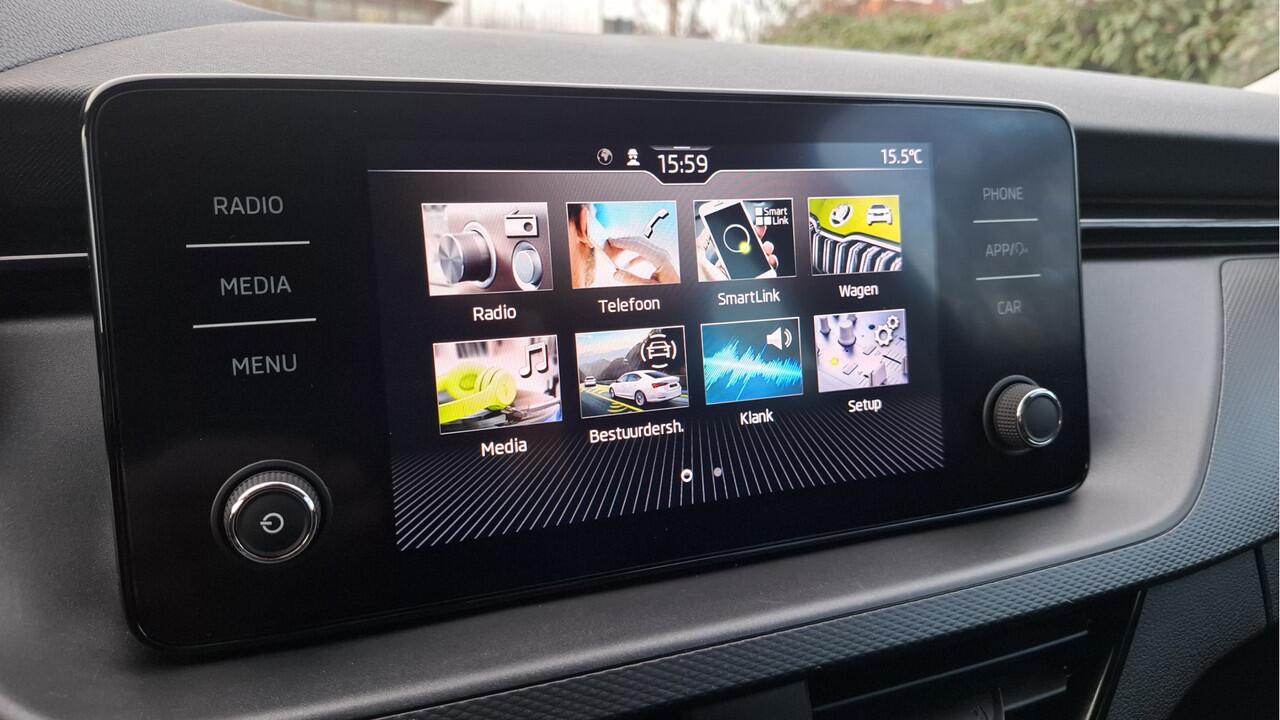 Deze auto gaat met je in gesprek. Hij vertelt met behulp van remote services alles over de status van diverse onderdelen en laat zich desgevraagd ook activeren. Gewoon via je smartphone. Onderweg geniet je van de kwaliteit van het audio-installatiesysteem met dab-ontvangst. De bediening is gemakkelijk via knoppen op het stuur. Parkeersensoren helpen je tijdens het in- en uitparkeren. Natuurlijk is deze ŠKODA Scala voorzien van cruise control. Natuurlijk is er in deze auto airconditioning aanwezig. Je bent in deze ŠKODA ook voorzien van lederen stuur