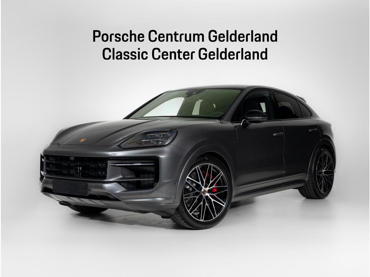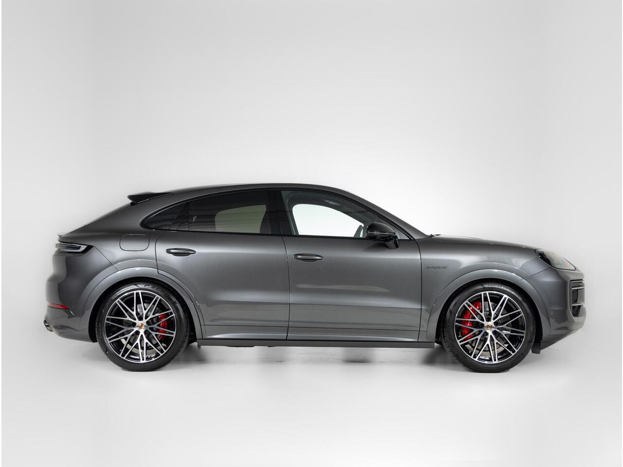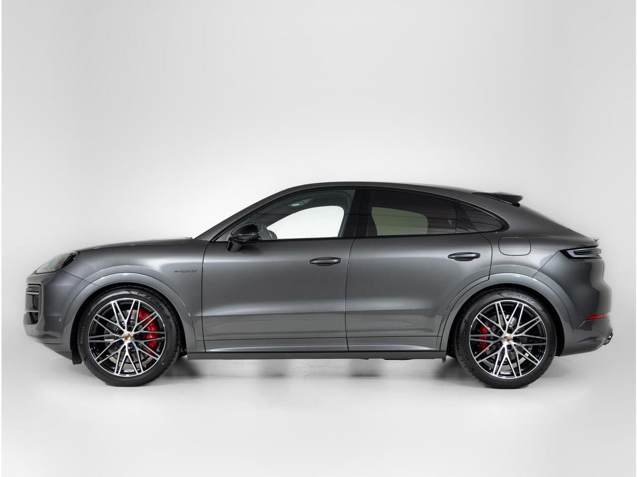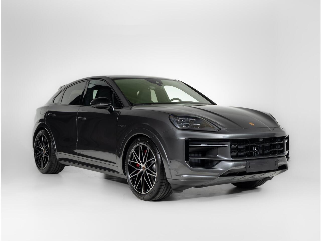 Deze Porsche Cayenne S E-Hybrid Coupé Black Edition in de kleur Kwartsiet Grijs metallic is nog nieuw en ongeregistreerd. De Porsche onderscheidt zich onder andere door unieke opties