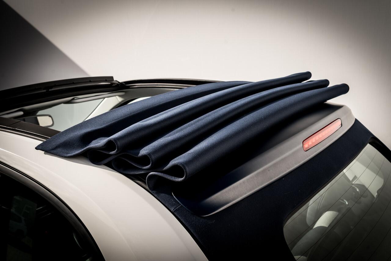 wit van kleur met een donkerblauw cabrio dak en 17 inch lichtmetalen velgen.