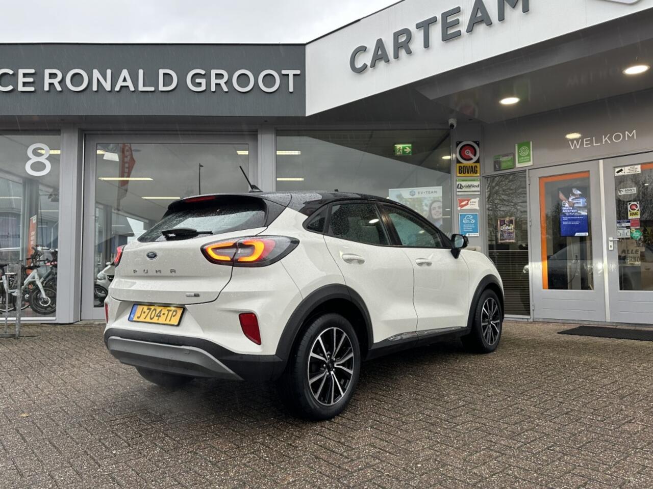want het audiosysteem (met DAB!) en het navigatiesysteem kunt u bedienen vanaf het stuur of met spraak. Geen onnodige spaghetti van oplaadsnoertjes voor de smartphone: deze Ford Puma heeft een draadloze oplaadmogelijkheid voor telefoons. Op een drukke weg heeft u soms ogen in uw achterhoofd nodig. De sensoren aan de achterzijde nemen die functie over en geven een achteropkomend verkeer waarschuwing als een achterligger te dicht op u zit. Met de aanwezige parkeersensoren weet u altijd zeker of het past. De uitrusting van deze auto is met WIFI-hotspot