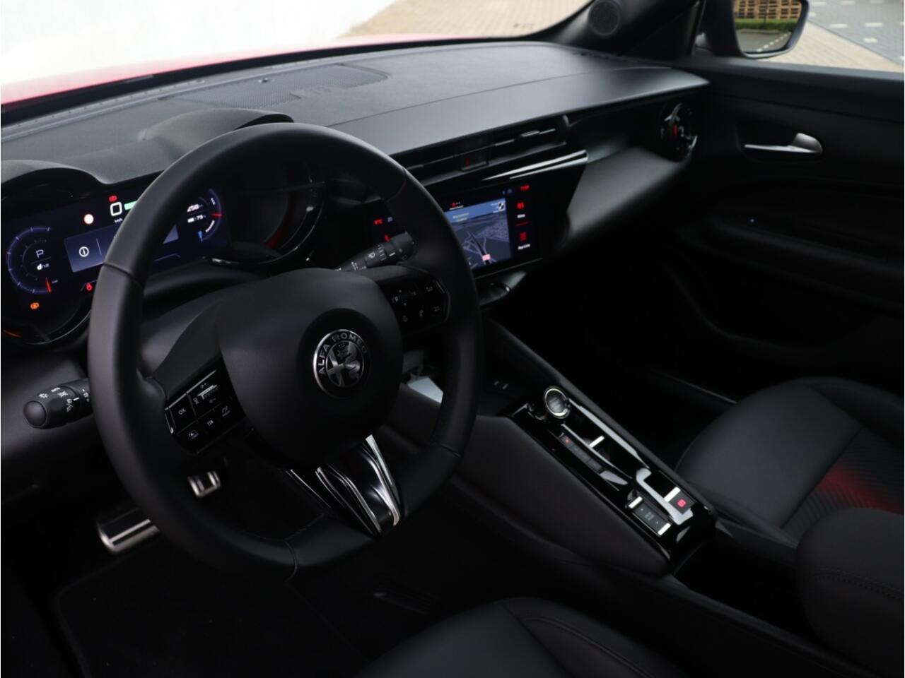 Sportieve Alfa Romeo Junior Elettrica Speciale 54 kWh in de kleur Brera Red metallic. Tevens voorzien van Pack Techno en 18" Petalli velgen!