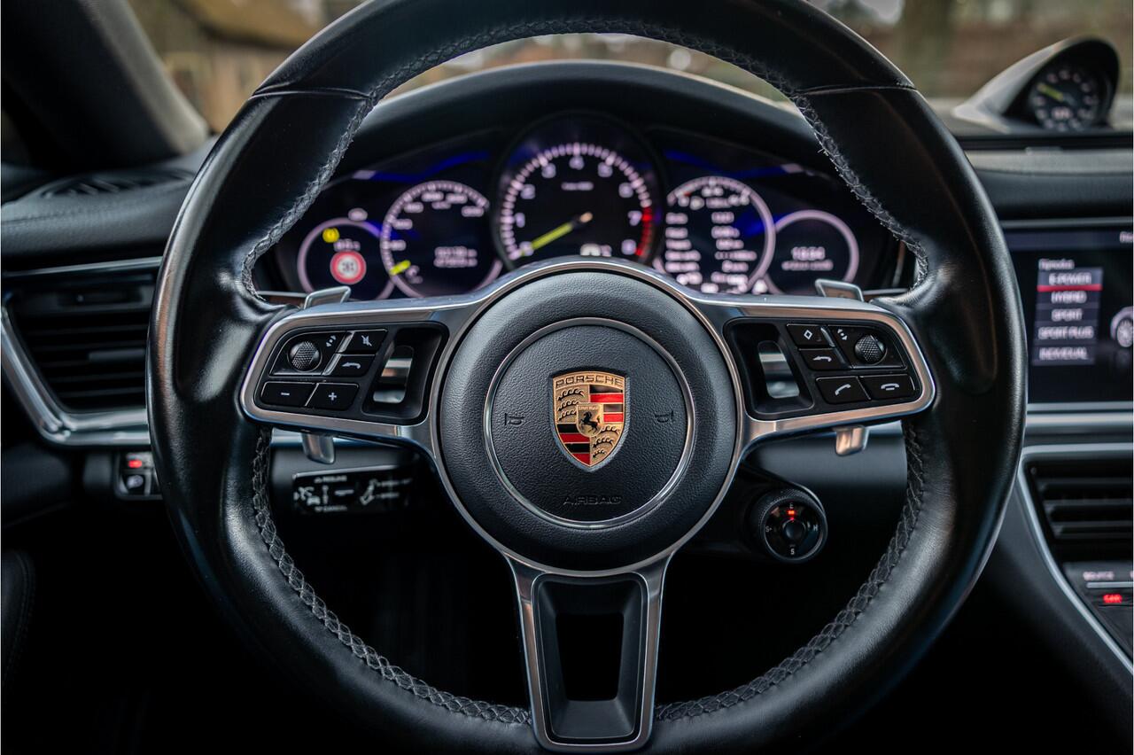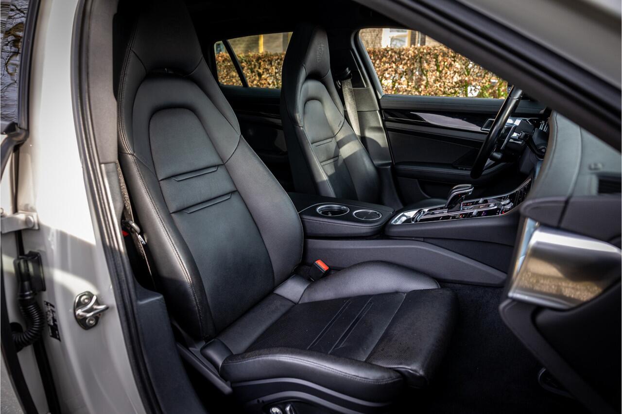 Fraaie Porsche Panamera Sport Turismo 4 Hybrid 10 Years Edition voorzien van een zeer complete uitrusting. Lakkleur is Krijt Grijs en het interieur is voorzien van 14-wegs verstelbare comfortstoelen bekleed met zwart leder. Het 21" Sport design wiel versterkt de dynamische uitstraling van de auto.