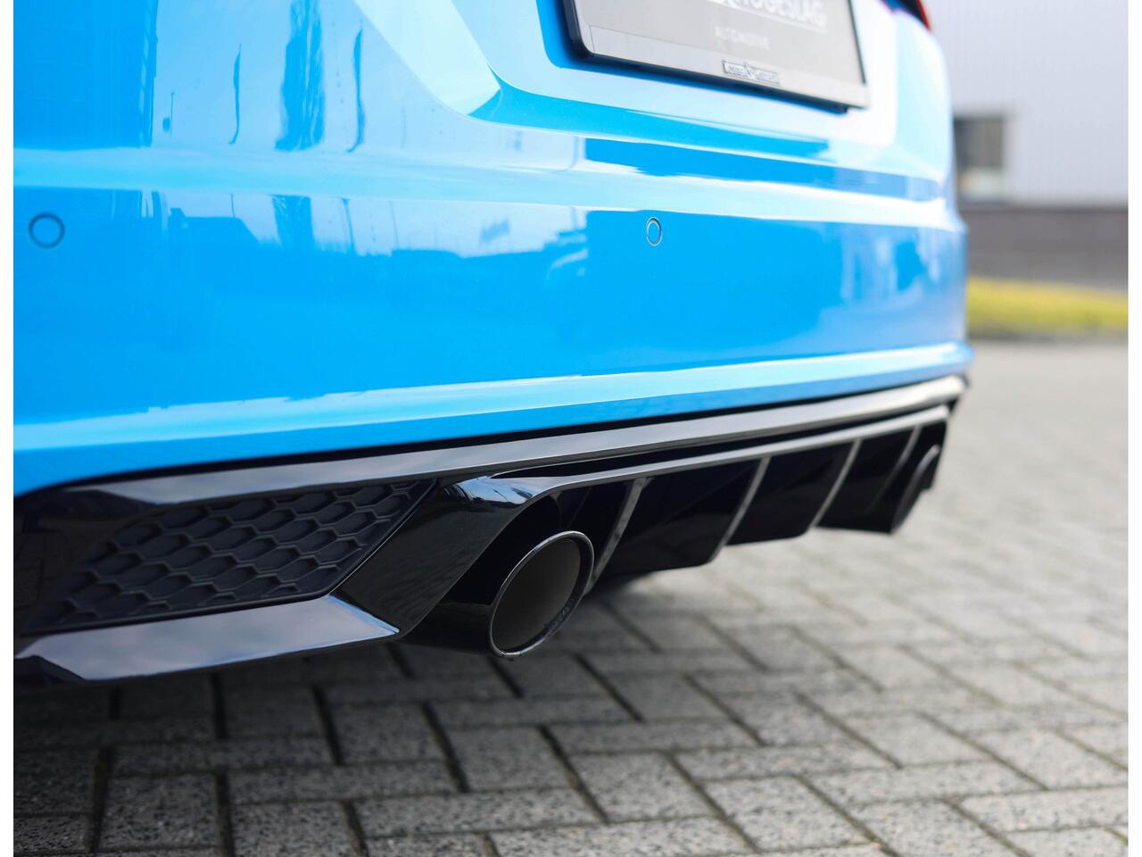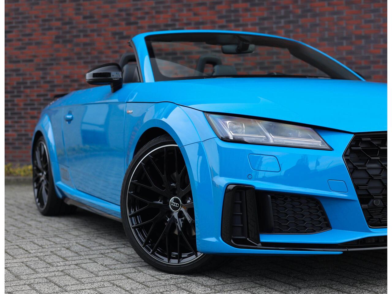Turboblauw. Een waanzinnig gave kleur die deze Audi TT perfect tot zijn recht laat komen. In combinatie met het blauwe contrasterende stiksel ontstaat een bijzonder sportieve uitstraling die direct de aandacht trekt. Een echte nekkendraaier. Alle details zijn uitgevoerd in hoogglans zwart