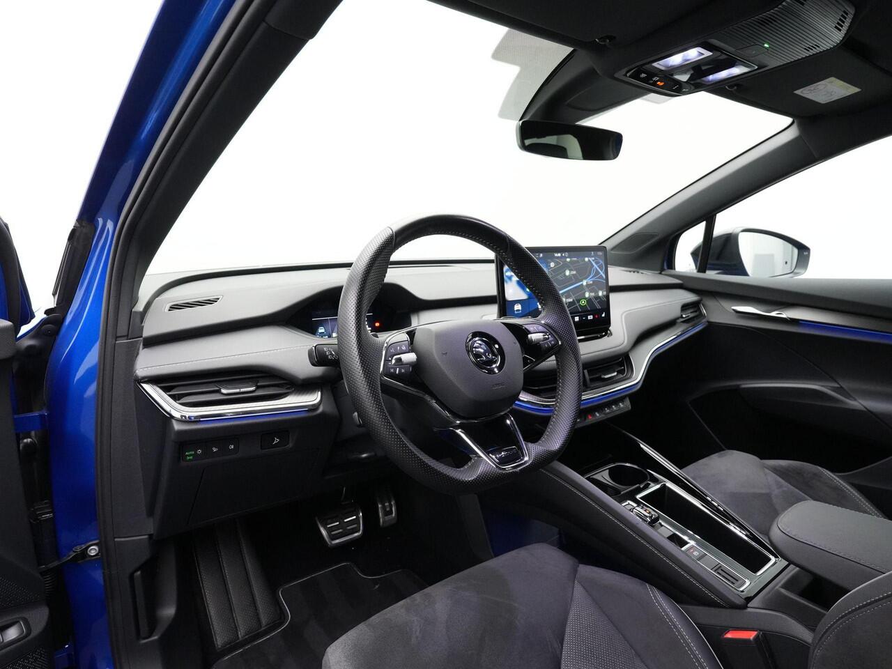 Deze Skoda Enyaq iV 80 Sportline combineert krachtige elektrische prestaties met een uitgesproken sportief design. Uitgevoerd in Race Blue metallic met zwarte accenten