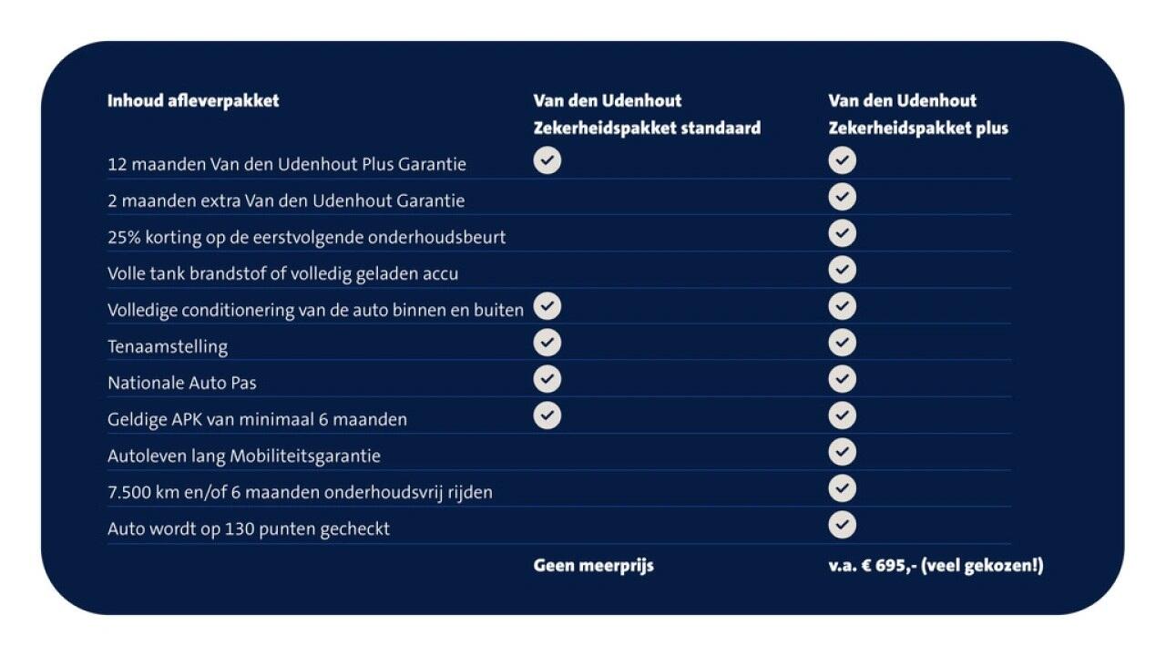 Kies voor extra zekerheid en koop jouw occasion in combinatie met het Van den Udenhout Zekerheidspakket Plus. Met het Van den Udenhout Zekerheidspakket Plus profiteer je onder andere van 14 maanden VDU Plus