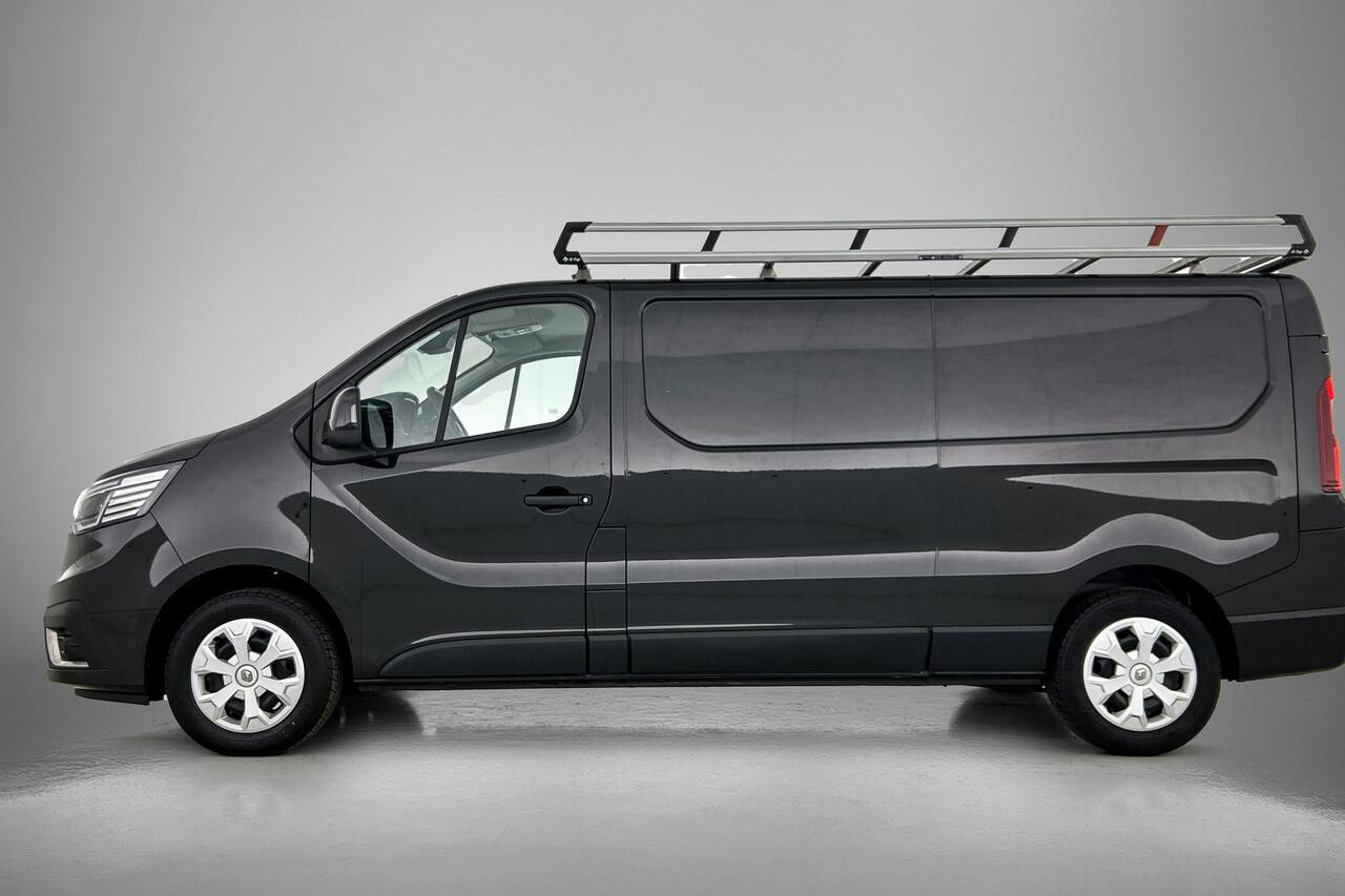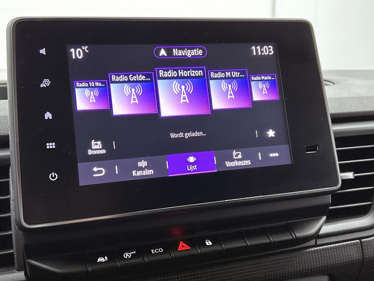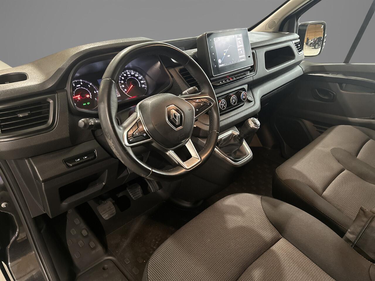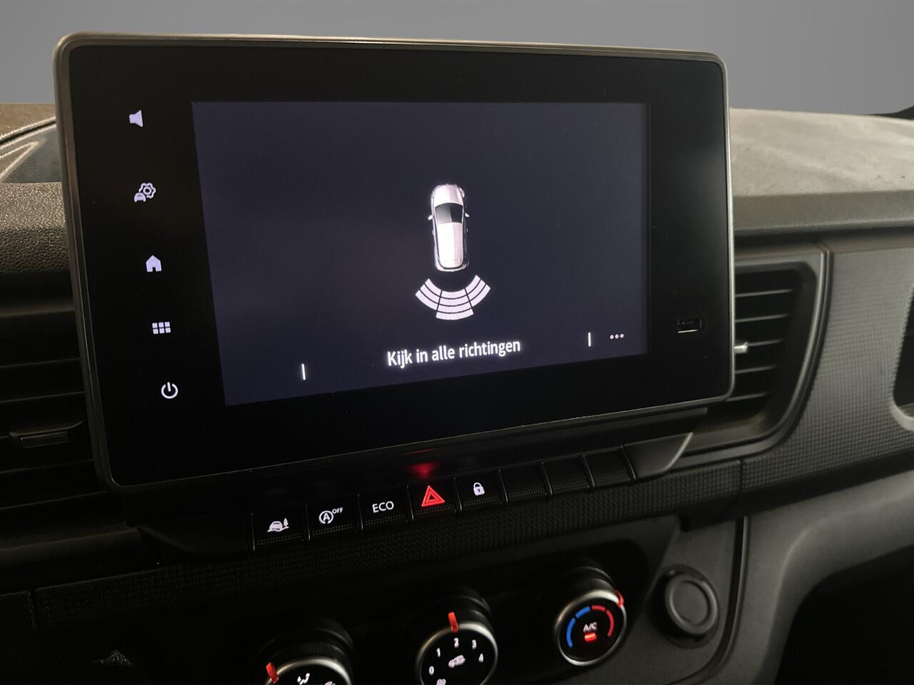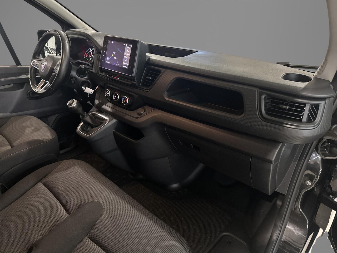 terwijl de auto de omgeving voor u in de gaten houdt. Een automatisch inschakelbare verlichting zorgt dat de verlichting aangaat als het donkerder wordt - in tunnels bijvoorbeeld - en de regensensor schakelt de ruitenwissers in als het nodig is. U hoeft er niets aan te doen. Natuurlijk is deze Renault Trafic voorzien van cruise control. Met één druk op de knop blaast de airconditioning een koele bries door het interieur. Deze auto is voorzien van buitentemperatuurmeter